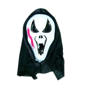 - It has a hood that comes all the way around the head and the white foam mask is painted black on the nose and mouth with a black mesh screen over the eyes.
